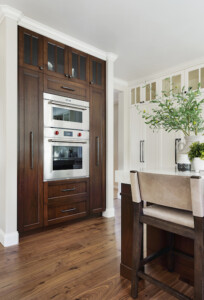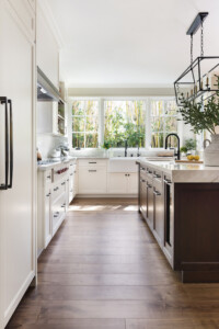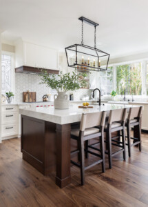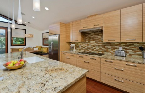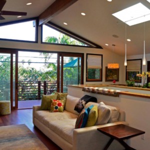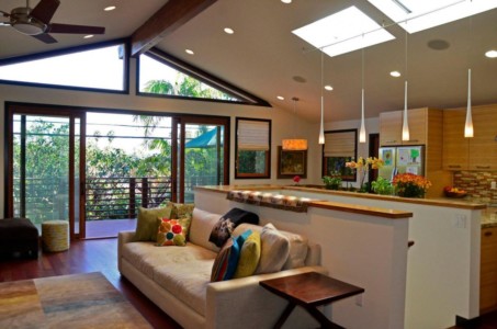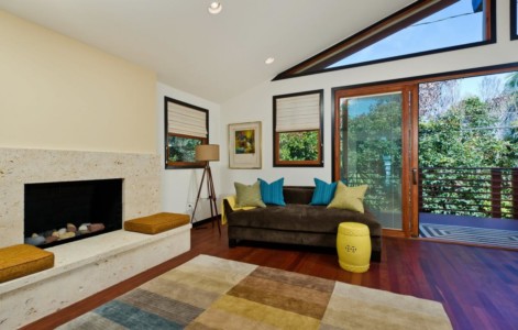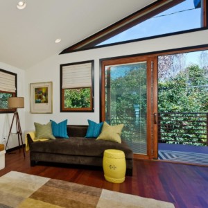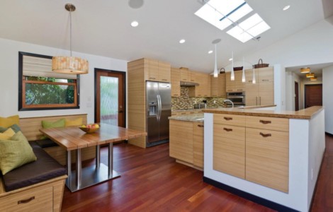 California Custom Creations did a complete interior demolition of the entire building down to the wood framing and removed the existing roof. Some existing walls were demolished as well. The lower level was extended into the existing grade under the house to construct more rooms and added square footage and value to the home. The roof was fully replaced by California Custom Creations, including four new skylights for the kitchen and master bedroom. The living room was joined with the kitchen by removing the structural wall that separated them, which provided a massive open space for the family to converge in. The feeling of openness was even more accentuated by the large east-facing windows above the four panel sliding door that leads to the cantilevered deck. In order to account for such an open space where there used to be a structure, CCC replaced the small non-structural ridge beam with a huge GLULAM beam and left it exposed and stained to display the structural feat that was accomplished. In the corner of the kitchen, a custom booth-style dinner table was designed and built using bamboo.